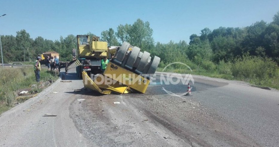 При падането си по таван на пътното платно тежката машина, която е била теглена от камион, затвори напълно едното платно. При инцидента няма пострадали, предаде Нова тв.