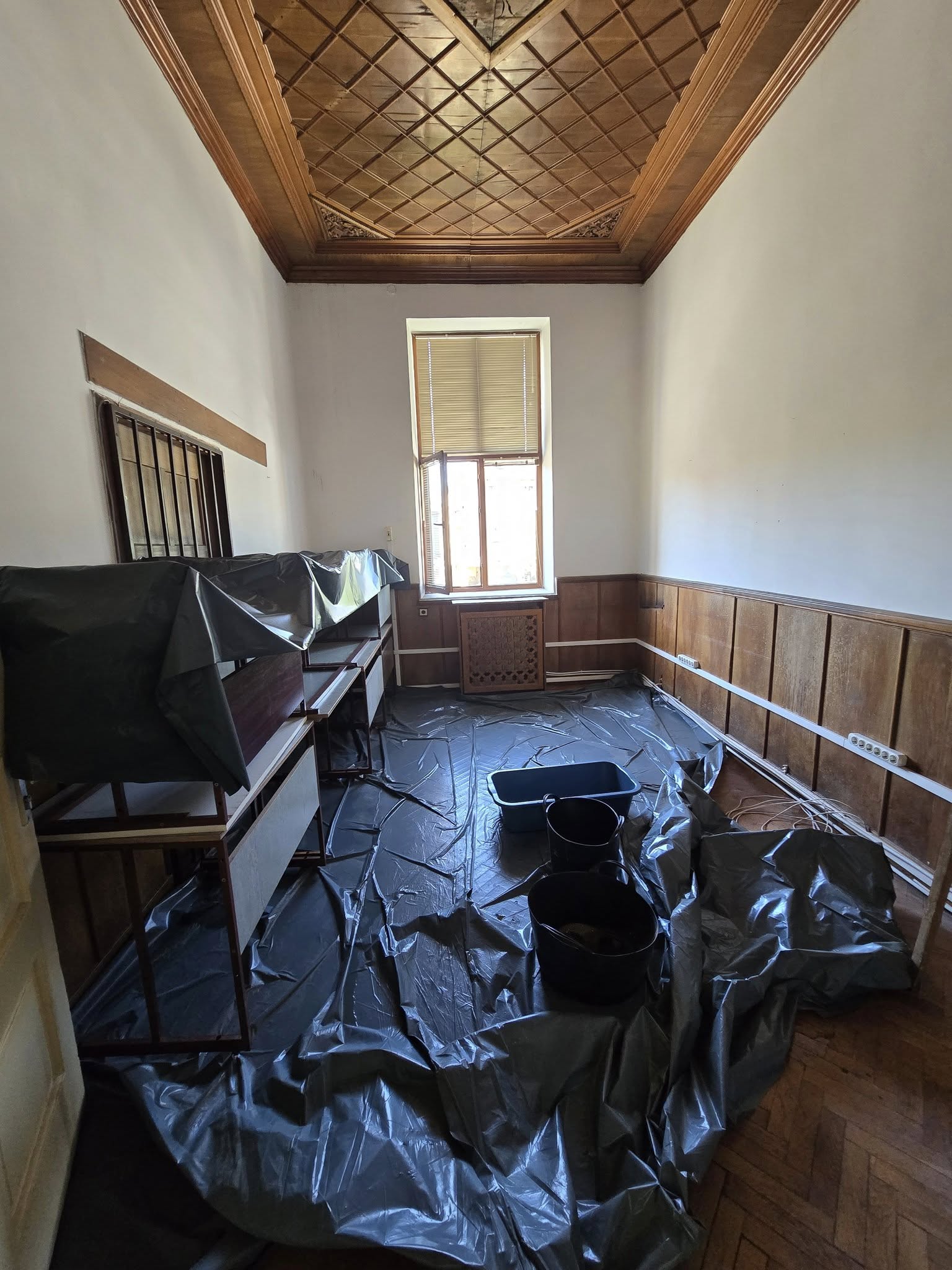 Изгорелият покрив на гимназията по приложни изкуства вече е отстранен, разчистен е и опожарения трети етаж на сградата. Заради обилните дъждове обаче вода тече и в стаите на втория етаж.