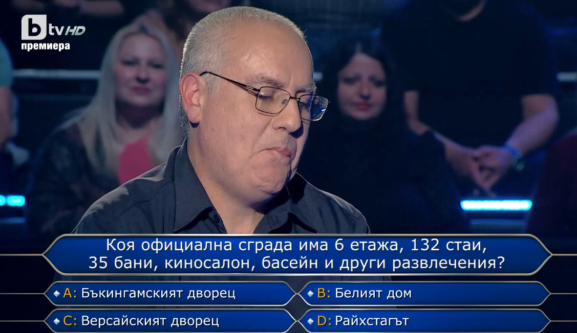 Въпросът за 3000 лева бе: Коя официална сграда има 6 етажа, 132 стаи, 35 бани, киносалон, басейн и други развлечения?, - Бъкингамският дворец, Белият дом, Версайският дворец и Райхстагът.