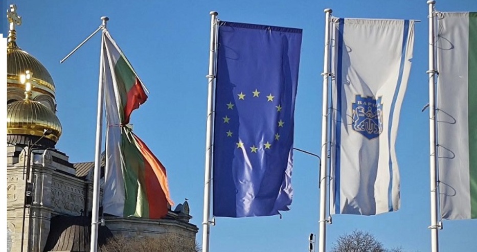 На снимката се вижда площада пред Катедралата и знамената на ЕС и община Варна, които са в добро състояние за разлика от националното.