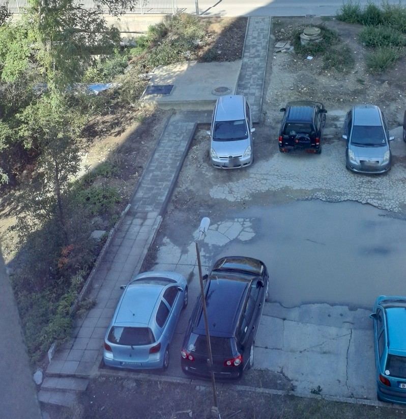 За паркинг към жилищен блок, чието състояние наподобява огромна яма, събираща дъждовната вода, сигнализира читател на Петел.бг.