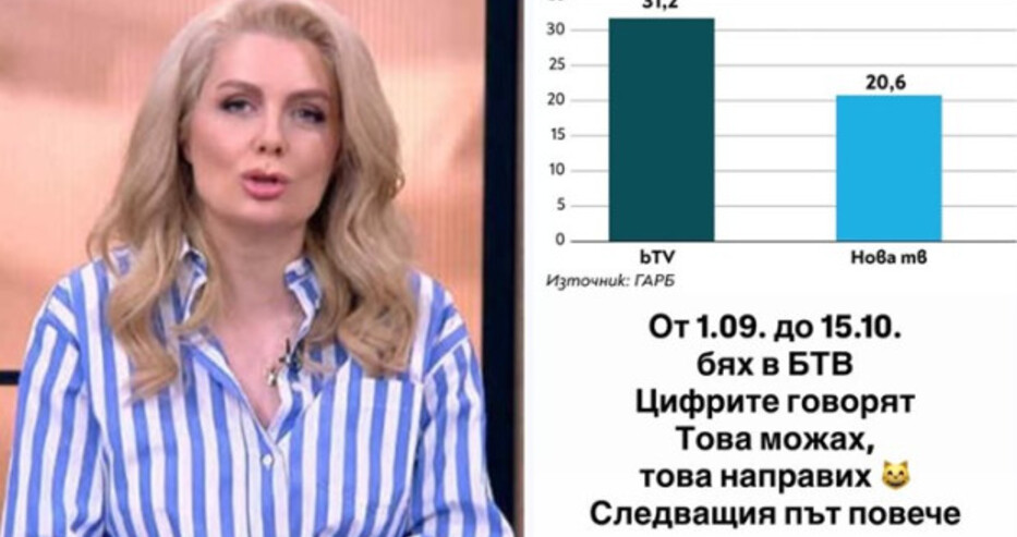 На кадъра Райкова споделя графика от ГАРБ, отразяваща резултатите на предаването "Преди обед" за периода 1 септември - 15 октомври 2025 г. Данните показват, че предаването е постигнало 31,2% аудиторен дял, докато конкурентното шоу по Нова телевизия е с 20,6%, предаде България днес.