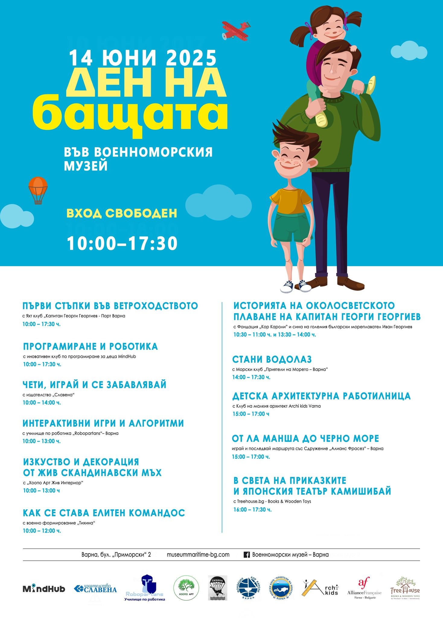 На 14 юни (събота) от 10:00 до 17:30 часа с вход свободен, много атракции, игри и изненади във Военноморския музей ще се проведе традиционното събитие за Националния военноисторически музей и неговите филиали – Ден на бащата. В този ден в музея всичко ще е безплатно, забавленията ще дебнат отвсякъде, а освен татковците и майките са добре дошли, съобщават организаторите.