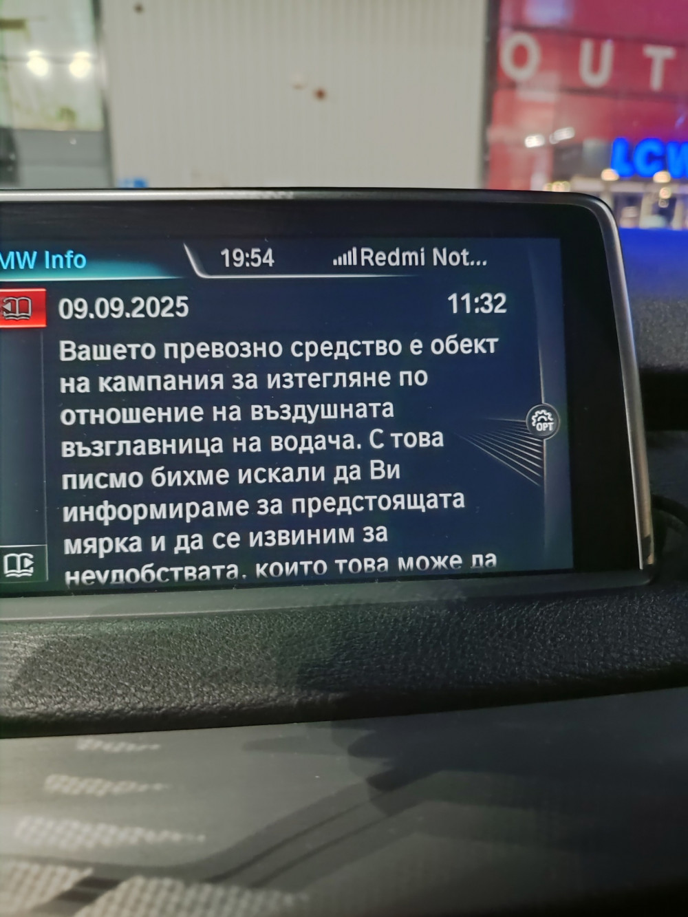 Той получава важно предупреждение на екрана на колата си: