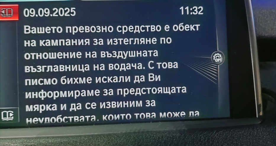 "Вашето превозно средство е обект на кампания за изтегляне по отношение на въздушната възглавница на водача. С това писмо бихме искали да Ви информираме за предстоящата мярка и да се извиним занеудобствата, които това може да причини"