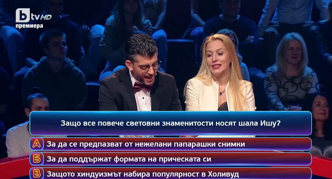 След като застана пред монитора, тя попита Сашо и Деси: Защо все повече световни знаменитости носят шала Ишу?, с възможности за отговори - А: За да се предпазват от нежелани папарашки снимки, Б: За да поддържат формата на прическата си, В: Защото хиндуизмът набира популярност в Холивуд.