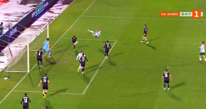 България и Грузия играят при 2:0 в световната квалификация на Националния стадион "Васил Левски". Георги Русев даде аванс на "лъвовете" с много красив гол в десетата минута. Крилото посрещна със странична ножица центриране на Здравко Димитров и нашите поведоха. В 24-ата минута Филип Кръстев удвои.