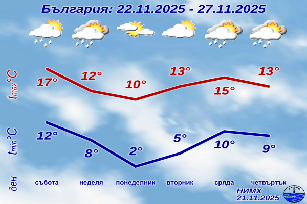 През нощта срещу неделя и в неделя от запад на изток ще превали, а вятърът ще се ориентира от запад-северозапад и с него температурите ще започнат да се понижават, отначало в Северна България, а впоследствие – и на юг и изток.