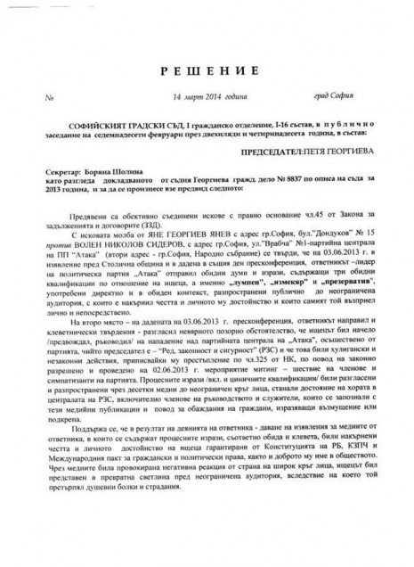 Председателят на съдебния състав Петя Георгиева е признала Сидеров за виновен в това, че на 3 юни 2013 година пред сградата на Столична община, той е обявил на висок глас: "Ние няма да позволим на нито един лумпен, дали той се нарича Валери Симеонов, Яне Янев или някой друг измекяр, да кощунства в близост до нашата централа в нарушение на закона....презервативите на Бойко, Валери Симеонов и Яне Янев, ще се сблъскат с твърдия отпор на "Атака".