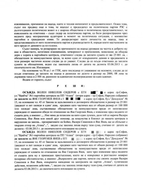 В мотивите за своето решение съдия Георгиева е отбелязала: "Съдът намира, че репариране на причиненото на ищеца (Яне Янев) уронване на престижа и доброто му име в обществото, негативни изживявания, затвореност и притеснения, нежелание дори да общува с хора от партийната централа, ответникът трябва да заплати 25 501 лева".