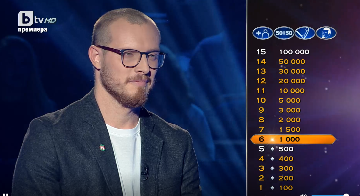 Специалист с разнороден опит се настани в стола на богатството. За Асен Топалов от Шумен се разбра, че е юрист, радио-телевизионен техник, графичен дизайнер и фотограф. Пред погледа на майка си Петя, която е съдия, той вдигна настроението в студиото след въпрос на водещия.