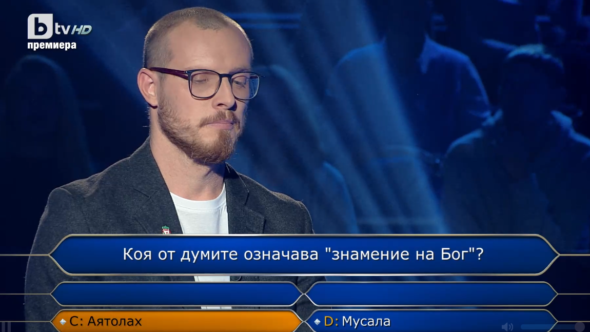 Асен заключи сумата за 3000 лева, а въпросът за нея бе: Коя от думите означава „знамение на Бог“? – Машала, Евала, Аятолах и Мусала.