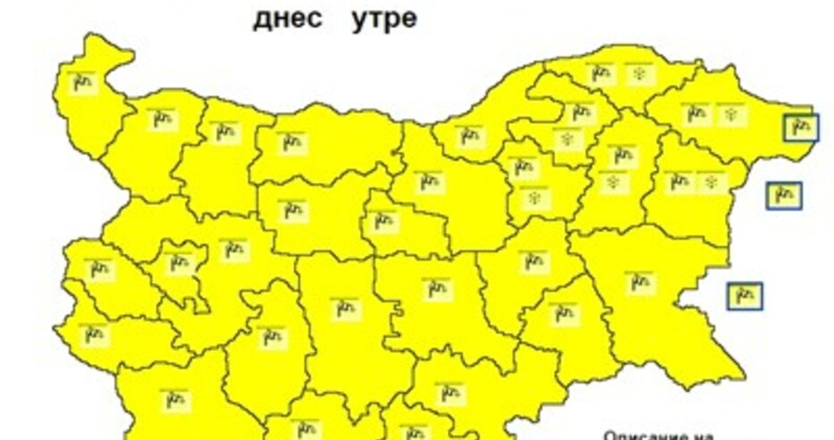 В шест области в страната има жълт код за вятър и сняг. Това са областите Търговище, Разград, Силистра, Добрич, Шумен и Варна. В тези области ще духа силен северозападен вятър със средна скорост 14-19 m/s и пориви до 25 m/s. Ще има условия за виелици и снегонавявания.