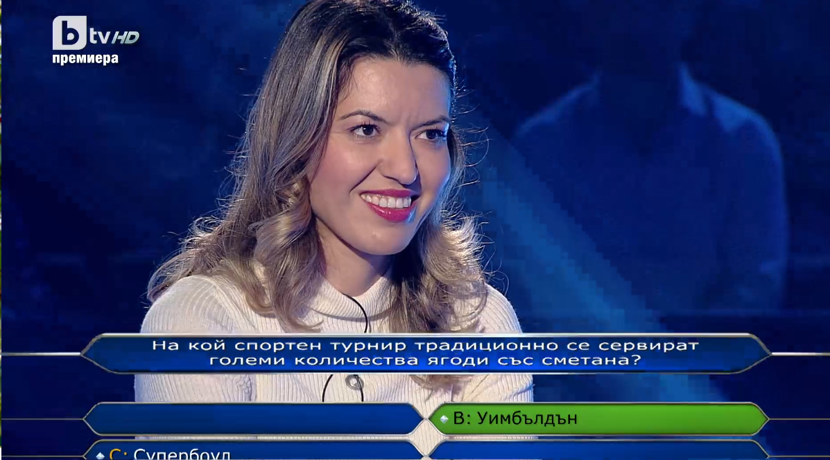Ивелина поиска „50:50“, но след като компютърът остави втората и трета опция, отново бе неуверена. Тя призова Ники Кънчев да й помогне и той го направи с Уимбълдън.
