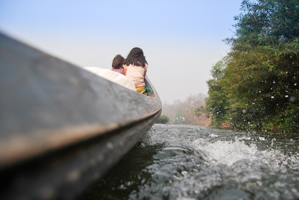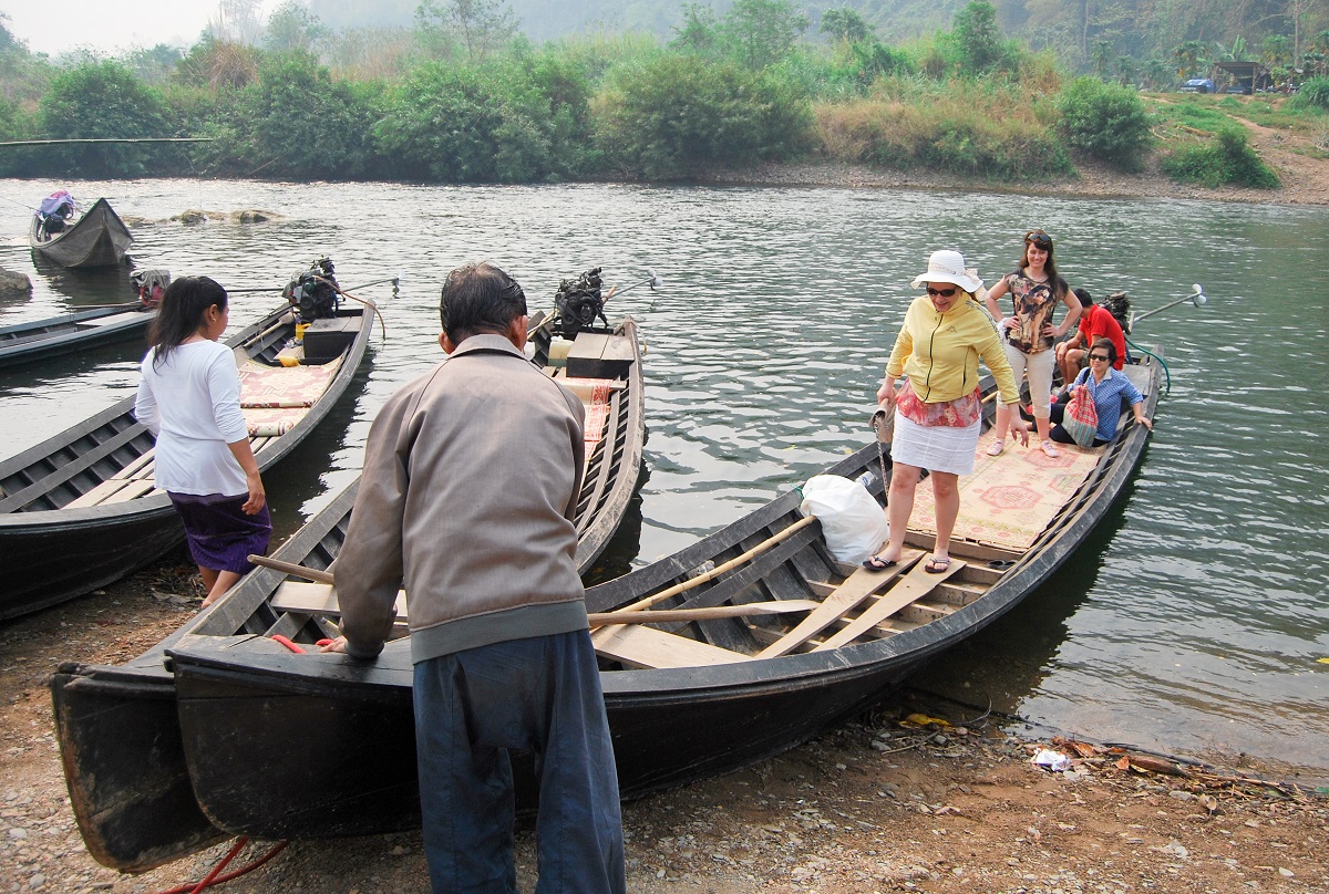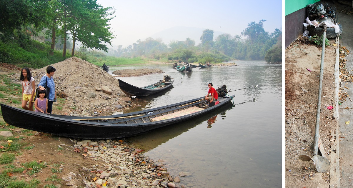 За да стигнете до селото на жените от племето Карен трябва да отидете до местното пристанище с кола или тук-тук. Казвате „Boat Landing” и всички знаят какво търсите и къде да ви заведат. Както виждате от снимките не бива да очаквате яхти и катери. Ние попаднахме тук в началото на сухия сезон и реката се беше отдръпнала, но това по никакъв начин не попречи на пътуването ни. На импровизираното пристанище ни посрещна също толкова импровизирания екипаж на продълговата пирога, която щеше да ме отведе далеч от цивилизацията. 4-5 годишна красавица и нейната сестричка помагаха на лодкаря да паркира тънката, като игла лодка, колкото си може по-близо до нас. После шляп-шляп двете се покатериха на носа й. Какво да се прави – и ние пляс-пляс през калта, но съвсем не толкова ловко, се озовахме в средата на тясната лодка.