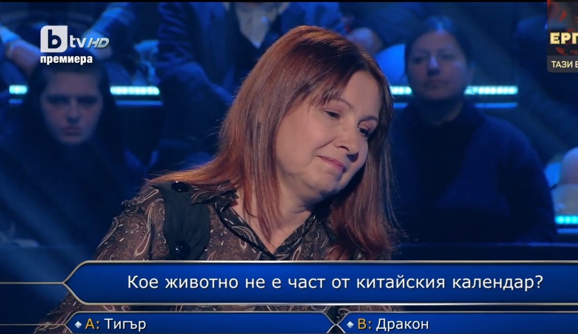 Участничката мина бързо през стартовите пет въпроса, гарантирайки си първа сигурна сума от 500 лева. Последва шестото питане: "Къде се пази "Дискът на безсмъртието", на който има дигитализирана ДНК на известни хора, сред които и Стивън Хокинг?" - "На Международната космическа станция", "В Антарктида", "В пустинята Атакама" или "В езерото Байкал". Тук пътешественицата се насочи към отговор "А", но реши да се подсигури, ползвайки жокер "Помощ от публиката". 74 процента от аудиторията в студиото потвърди нейното предположение и това се оказа правилно.