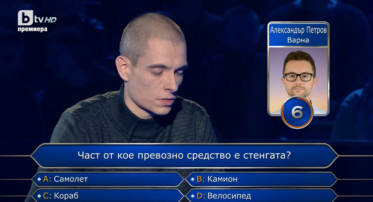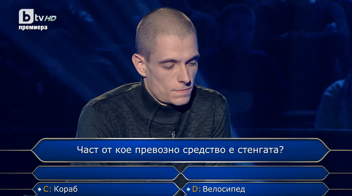 Въпросът за 1500 лева беше: „Част от кое превозно средство е стенгата“? - Самолет, Камион, Кораб и Велосипед.