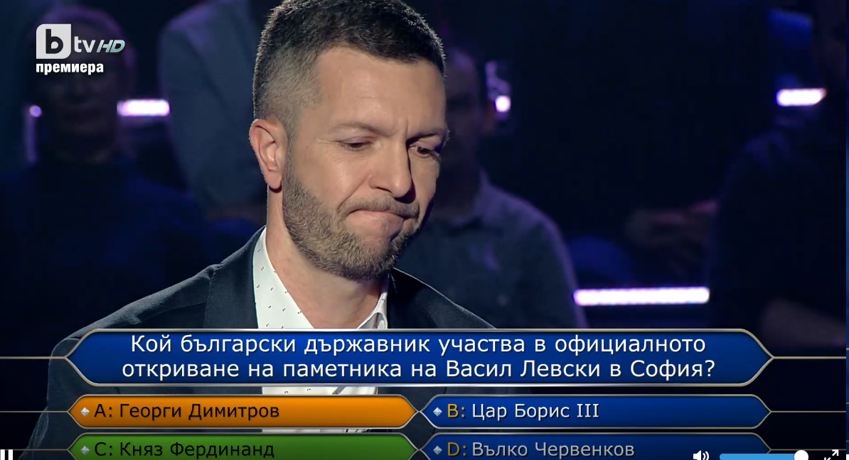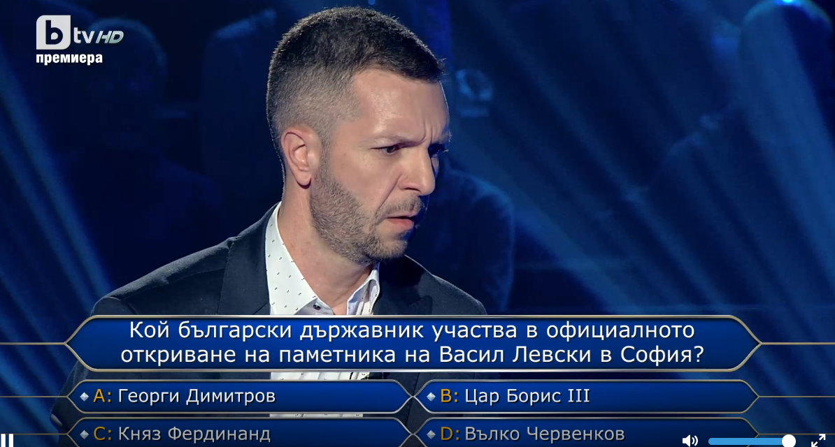 Играчът заключи тази сума, а за нея бе попитан: Кой български държавник участва в официалното откриване на паметника на Васил Левски в София? - Георги Димитров, Цар Борис III, Княз Фердинанд и Вълко Червенков.