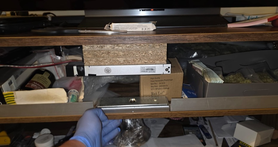 Последвали оперативни действия в жилище в столичния квартал „Хаджи Димитър“, ползвано от продавача за укриване на наркотиците. В апартамента е открит тайник в телевизионен шкаф, отварящ се с дистанционно управление и магнит, като от там са иззети множество полиетиленови пликове, съдържащи повече от килограм марихуана, бяло прахообразно вещество, реагиращо на кокаин - около 80 г, около един килограм таблетки екстази и амфетамин, електронна везна, вакуумираща машина и парична сума - 29 000 лева и близо 2 000 евро.