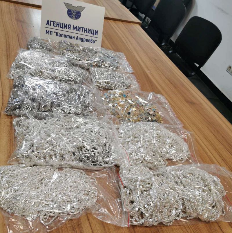 24,3 кг сребърни и 1,6 кг златни бижута откриха в последните дни митничари на ГКПП Кап.Андреево в автобуси, пътуващи от Турция за Сърбия. Контрабандата е заловена при две отделни проверки на 4 и 6 август, съобщиха от Агенция “Митници”.