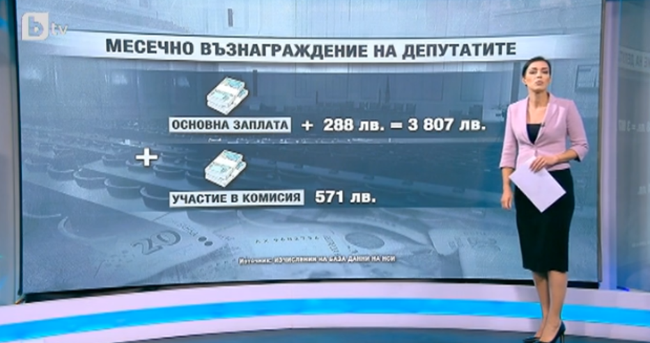 Така основната заплата на народните избраници нараства с близо 300 лв. и надхвърля 3 800 лв. Депутатите, които са в постоянни комисии получават още 15% отгоре, което означава, че те месечно ще се разписват върху поне 4 378 лв, съобщава bTV.