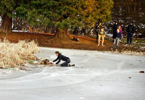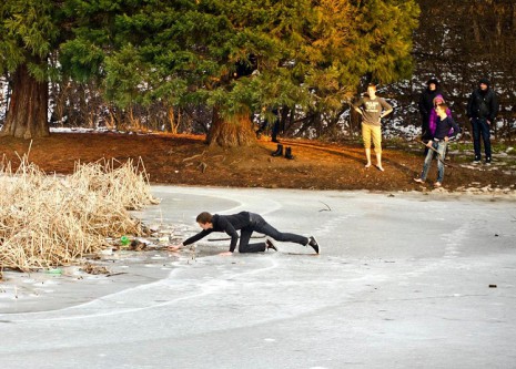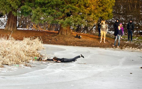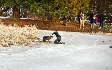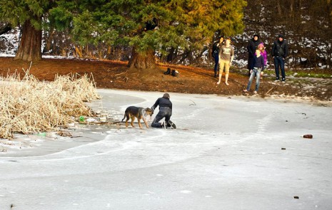 "Днес се разхождахме в южния парк, когато станахме свидетели на затрогваща случка, която ми възвърна позитивизма по отношение на днешните тийнове. Считаме, че почти аксиоматично те са келеши или кифли, които газят през трупове за да постигнат каквото искат в момента и за никой и нищо не ги е еня, но ето, че имало и свестни деца! Та на случката: както си ходехме, аз с кенгуруто и Невена в него, а Лили до мене бута количката - аз забелязвам един келеш, който си събува обувките и чорапите и се гласи да прави някаква магария на замръзналото езерце, там, до недостроената черква, срещу Луи Айер, сещате ли се? В следващия момент забелязвам, как едно бяло куче се мотае около тръстиките в центъра на езерцето и нещо се държи странно... с вглеждане виждам, че друго куче е пропаднало през леда и се опитва да излезе, а не може. И бялото куче, и пропадналото куче не бяха домашни - нямаха каишки и бялото трудно можеше да бъде определено като "бяло" на цвят... Групичката тийнове се събуваха и събличаха в явен опит да помогнат на помияра. След кратък размисъл излъчиха най-лекия от тях, който запълзя на четири крака по леда, взел клон, към кучето... тогава се сетих, че нося апарат. Извинете фотографа - той толкова си може, а децата заслужават дебели адмирации за постъпката си! Имало свестни деца! Дано не избягат..."