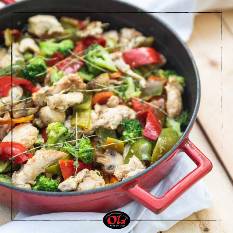 Пиле Верона с ароматна мащерка от OLA – taste of med! Както всяко едно от ястията на OLA, така и това апетитно предложение е сготвено във висококачествен чугунен съд, без вредни примеси