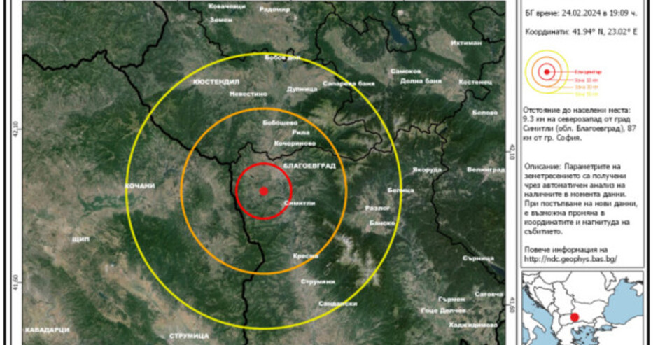 Земетресение с магнитуд 3.2 по Рихтер е регистрирано в района на Симитли, показва справка на сайта на Националния институт по геофизика, геодезия и география, видя "Фокус".
