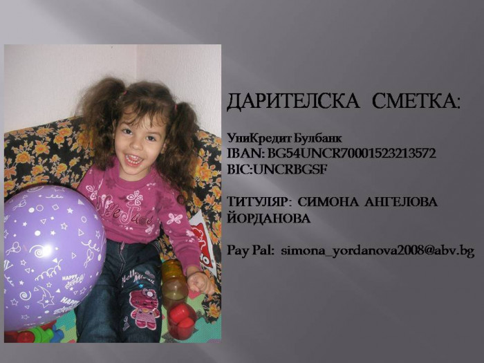 Дъщеря ми се казва СИМОНА АНГЕЛОВА ЙОРДАНОВА на 9г, тя е едно лъчезарно и любопитно дете, страда от ДЦП - спастична квадри пареза. Няма епилептични пристъпи.