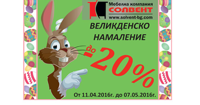 Фирма за мебели "Солвент" ще радва още повече клиентите си от 11.04. до 07.05.2016 г. с до 20% намаление на цените си.