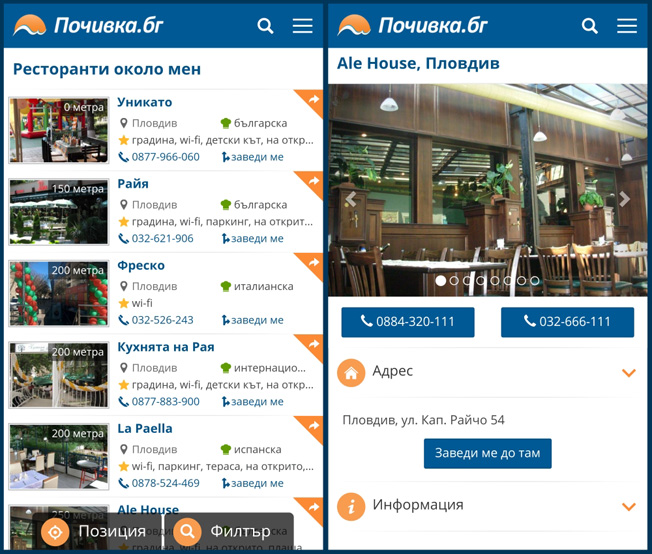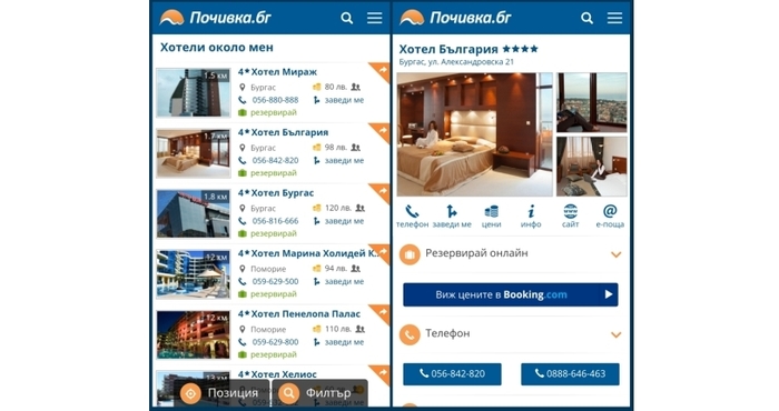 С мобилната ни версия по всяко едно време може да видите къде да отседнете и да се обадите директно в хотела, за да направите запитване или резервация.