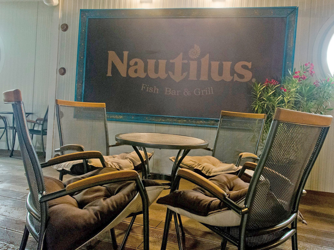 Дизайнерска обстановка на ресторант "Наутилус" допълва атмосферата в комплекса. Тук можете да опитате морски специалитети, пици и барбекю по оригинални рецепти. Прясната и вкусна риба, заедно с хрупкави картофки са приготвени на момента.