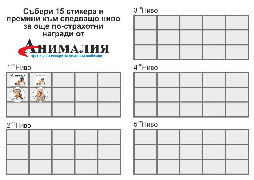 Всеки клиент, който е закупил храна и аксесоари от магазин "Анималия" на всеки 10 лева от покупката получава стикер. Залепва стикера на определено за целта място в талона. Могат да се достигнат 5 нива на събиране на стикерите и да се получат различни награди.