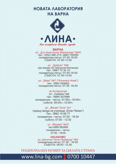 Профилактичните кампании се извършват в самостоятелните лаборатории на „ЛИНА” в областите Варна, Бургас и Ямбол. Добре е изследванията да стават сутрин, на гладно. Таксата манипулация е 2 лв. Готовите резултатите трябва да се консултират с лекар.