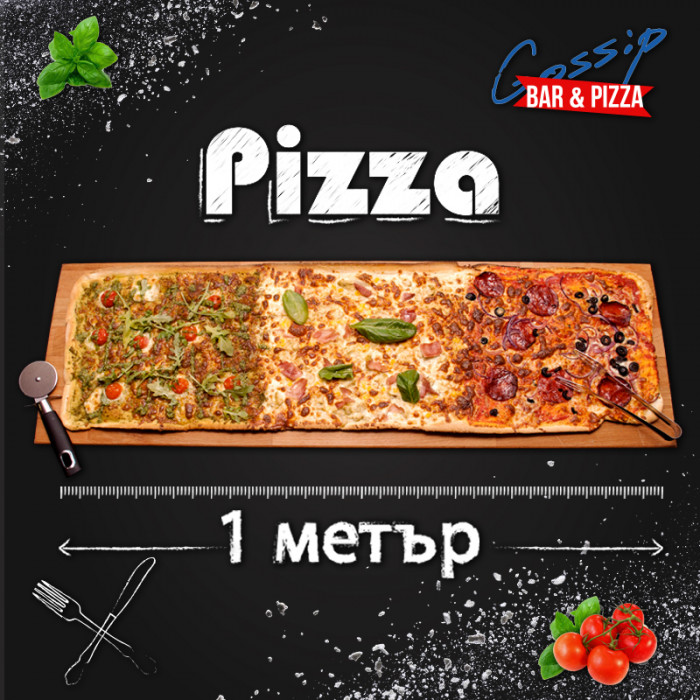 Най-новият хит в него е пица, дълга... 1 метър. Още по-хубавото е, че тя може да не е изцяло от един вид, а всеки клиент или компания има възможност да си я комбинира според вкуса си. Защо да избирате дали да ядете Маргарита, Капричоза или Неаполитана, когато можете да си ги поръчате и трите накуп? В Gossip Bar & Pizza това е напълно възможно.