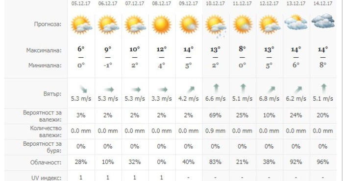В сряда вятърът ще отслабне, ще е до умерен от северозапад. Ще има променлива облачност, не са изключени изолирани слаби превалявания от сняг. Минималните температури ще са между минус 5 и 0 градуса, а максималните - между 5 градуса и 10 градуса.