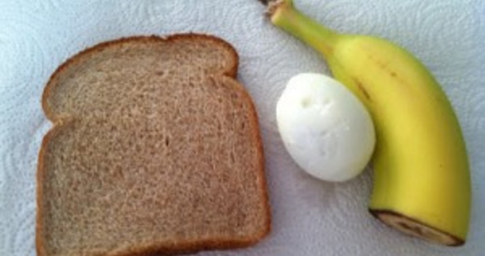 Закуска: Препечена филия пълнозърнест хляб, едно твърдо сварено яйце, половин банан, чаша кафе или чай (по желание).