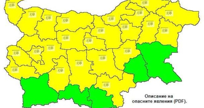 Предупреждението е в сила за областите: София, Видин, Монтана, Враца, Плевен, Ловеч, Перник, Кюстендил, Пазарджик, Пловдив, Стара Загора, Габрово, Велико Търново, Сливен, Търговище, Русе, Разград, Шумен, Силистра, Варна и Добрич. В тези райони се очакват валежи от сняг, които през деня, с повишението на температурите, на места ще преминават в дъжд и ще има условия за образуване на поледици, пише Канал3.бг.