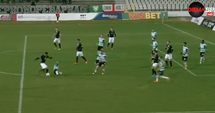 В 79-ата минута след центриране на Ндонгала отдясно първо Минчев, а после и Кузма се разминаха с топката.