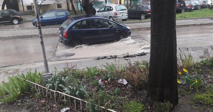 След дъжда на мястото се е образувала огромна локва и автомобилите трудно се разминават, а ако някой шофьор случайно не намали, рискува поражения по колата.