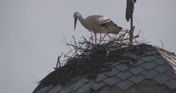 Заради ремонт на пострадалия от ветровете купол на църквата в село Бял Извор 150-килограмово гнездо бе преместено върху стар електрически стълб. Щъркелът обаче не хареса новото място и пак започна да строи върху покрива на храма, предава Бтв.