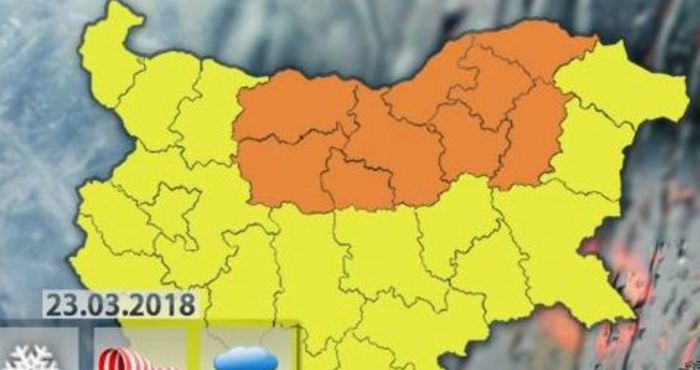 Оранжев код за обилни снеговалежи и силен вятър е обявен за девет области в страната. Предупреждението от втора степен се отнася за: Плевен, Ловеч, Габрово, Велико Търново, Русе, Търговище, Разград и Силистра, съобщава БНТ.