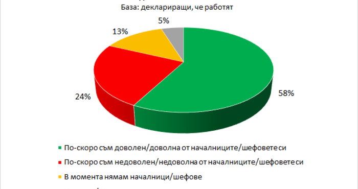 58% от работещите пък казват, че са доволни от шефовете си, 24% не са, а 13% казват, че нямат шефове. Останалите се затрудняват да отговорят.
