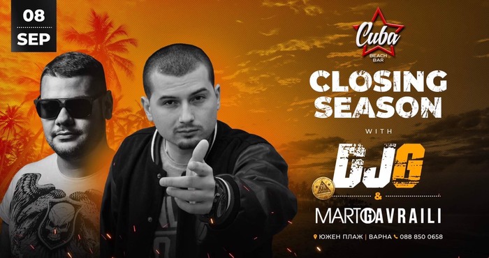 Едни от най-емблематичните Ди джеи, Марто Гавраили (house) World up label и D.J G(Black & R&B musik), ще закрият летния сезон с колосално парти в Куба бийч бар. Почитателите на горещите емоции и морския бряг, ще имат уникалната възможност да се включат в съвместната им емблематична изява на Варненския бряг, тази събота, 8 септември. Майсторите на пулта са подготвили зашеметяваща компилация от саунд, прецизни технически умения и мощни парчета, за да "взривят" като за последно БАРЪТ ДО МОРЕТО. Благодарение на съдействието на Premium quality Bulgaria, Куба бийч бар, ще заблести с невероятни визуални ефекти, звук и светлинно шоу.