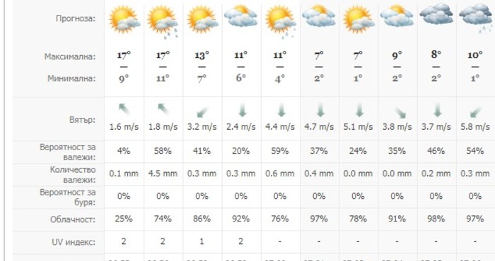 През нощта срещу вторник и във вторник със североизточен вятър ще проникне малка порция студен въздух. Ще има временни увеличения на облачността, почти без валежи. Дневните температури ще се понижат и максималните ще са предимно между 10 и 15 градуса, в Югозападна България, където ще остане предимно слънчево, до 18-19 градуса.