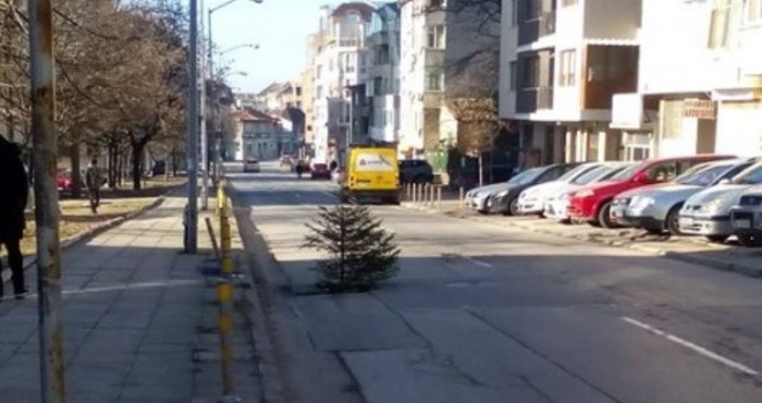 В опасната за автомобилите дупка е поставено коледно дръвче, което да обърне внимание на шофьорите.