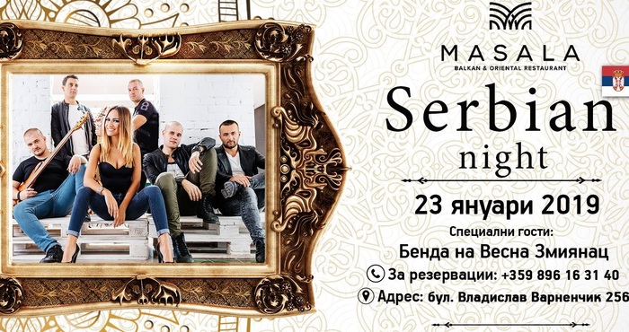 Тази сряда (23 януари) пък за настроението на гостите ще се грижи бендът на култовата сръбска певица Весна Змиянац. Те ще загреят обстановката подобаващо като анонс за идването на самата изпълнителка на "100 живота", която ще гостува в "Масала" съвсем скоро.