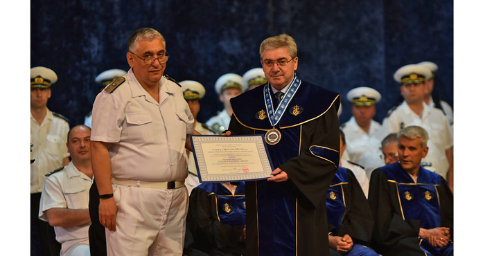 На вълнуваща церемония днес ректорът на ВВМУ „Никола Вапцаров” флотилен адмирал проф. д.в.н. Боян Медникаров удостои с почетното научно звание „Доктор хонорис кауза” ректора на МУ-Варна проф. д-р Красимир Иванов. Високото академично звание бе връчено на проф. Иванов по решение на Академичния съвет на ВВМУ „Никола Вапцаров” от 5 март 2019г. за усилията му за реализирането на каузата за откриване на съвместна специалност „Военен лекар“ между Морско училище, МУ-Варна и ВМА.