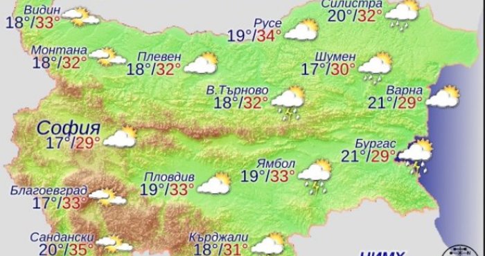 Ще преобладава слънчево време, след обяд с развитие на купеста и купесто-дъждовна облачност и на места ще превали краткотраен дъжд с гръмотевици. Ще духа слаб, в източните райони до умерен североизточен вятър. Преобладаващите максимални температури ще бъдат между 29° и 34°.