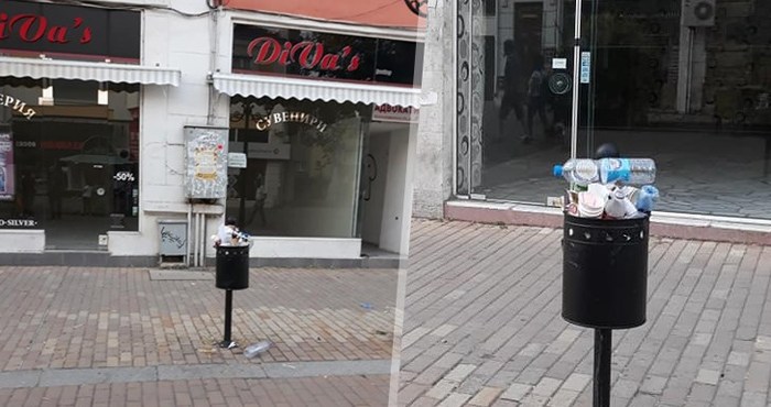 Фотосите са от централната улица на Русе - препълнени кошчета с боклуци на фона на празни магазини.